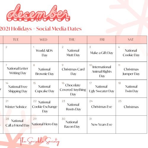 From family in town and friends visiting to holiday shopping and prep, we know how crazy this month can get. If you need a bit of inspiration to finish out your content plans, you’re in luck! From national days of awareness to fun days of celebration, you can use this calendar as a tool for new ideas or inspiration that is relatable to you and your audience.