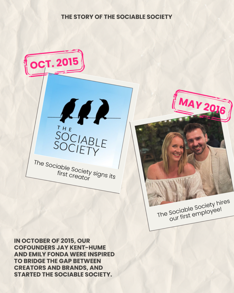 In October of 2015, our cofounders Jay Kent-Hume and Emily Fonda were inspired to bridge the gap between creators and brands, and started The Sociable Society.