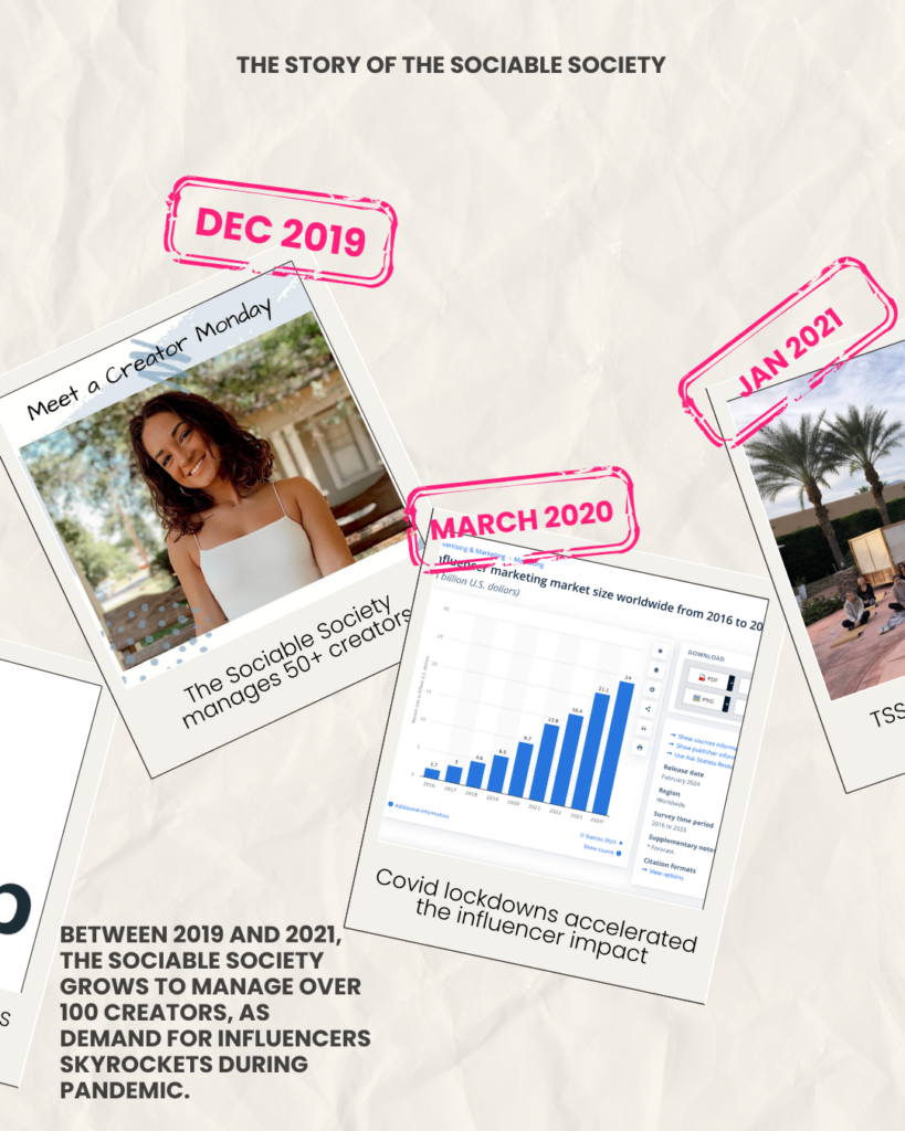 Between 2019 and 2021, The Sociable Society grows to manage over 100 creators, as demand for influencers skyrockets during the pandemic.