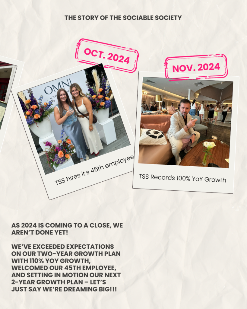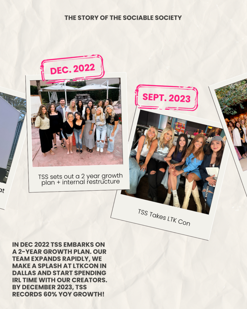 In Dec 2022, TSS embarks on a 2-year growth plan. Our team expands rapidly, we make a splash at LTKCon in Dallas, and start spending IRL time with our creators. By December 2023, TSS records 60% YoY growth!
