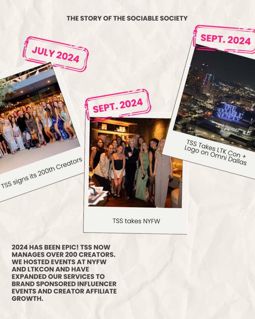 2024 has been epic! TSS now manages over 200 creators. We hosted events at both NYFW and LTKCon and have expanded our services to include both brand-sponsored influencer events (Events & Activations) and creator affiliate growth (Creator Growth Division).