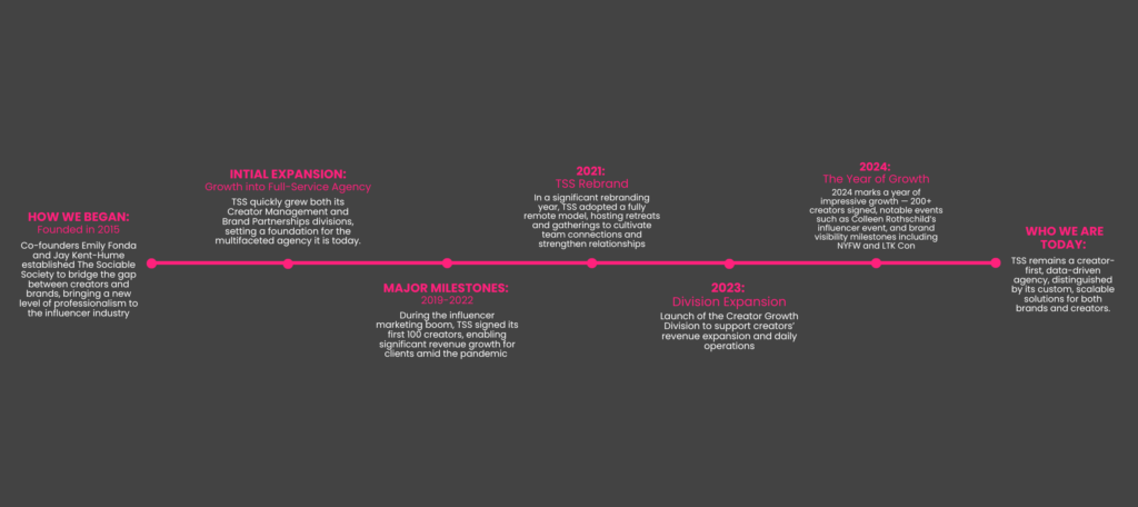Through nearly a decade of growth, we’ve built a vibrant community of creators and a network of brand partnerships that reflect our dedication to quality and innovation. With milestones like signing our 200th creator and collaborating on impactful brand campaigns that have reached audiences worldwide, each step has strengthened our commitment to the people and partnerships that make up TSS.